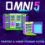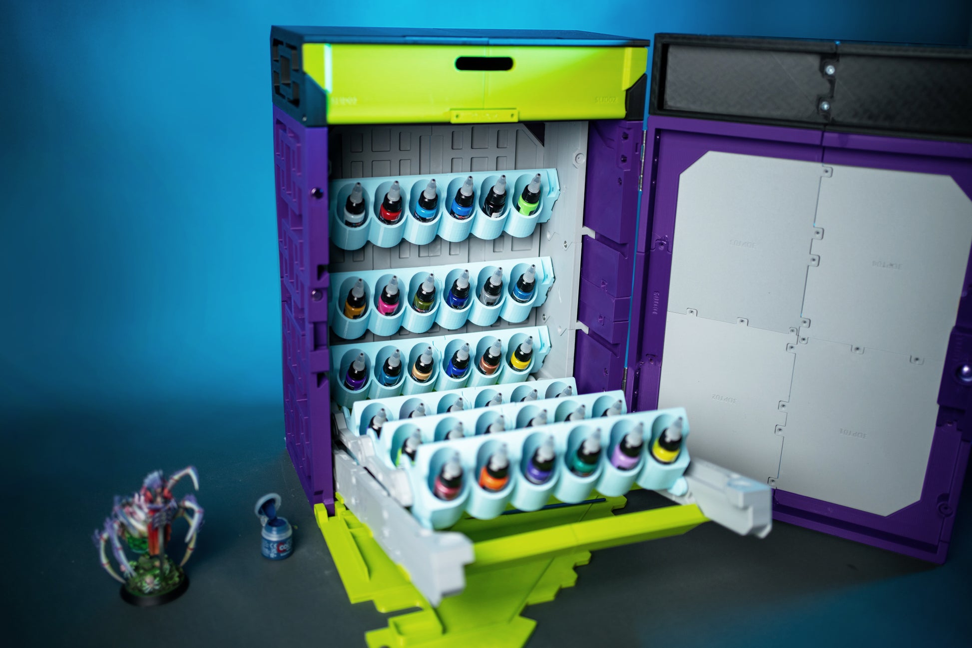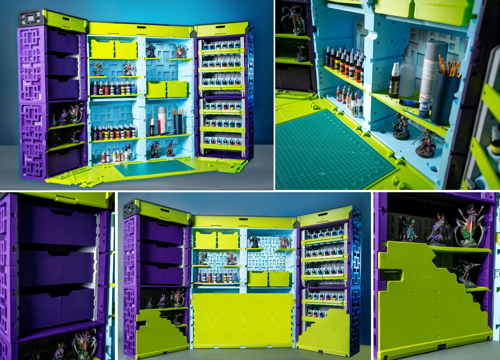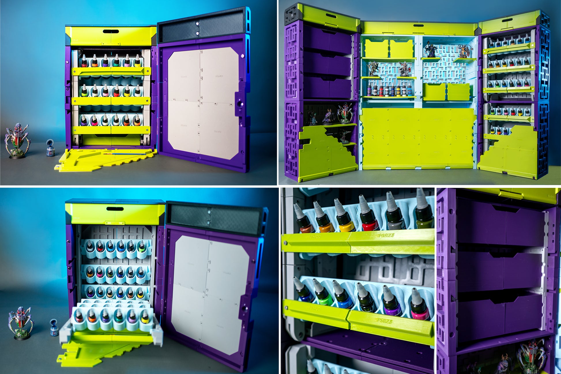 -Swappable Inserts. Multiple insert options for paint storage, drawers, shelves, pegboards, and miniature displays.