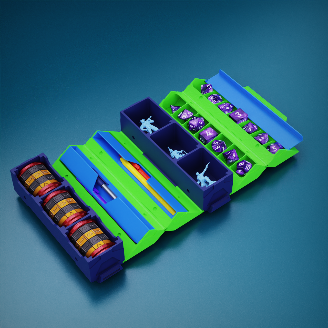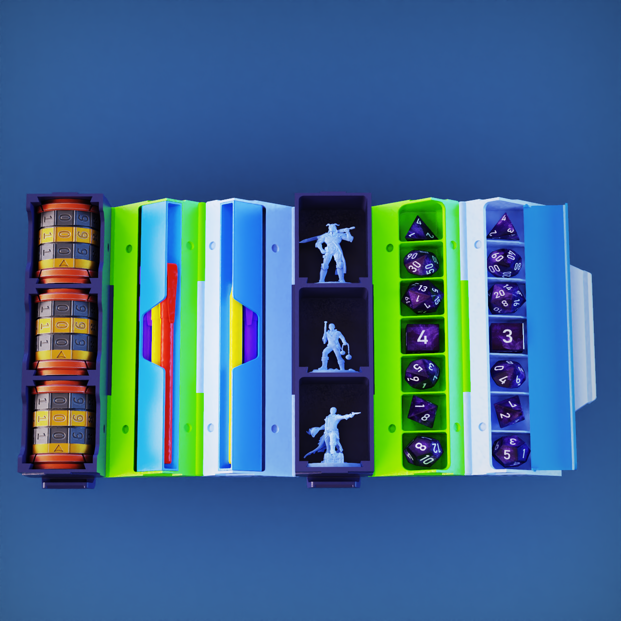 With slots for two sets of seven dice, two sleeves for pens and tokens, and six large compartments for miniatures, health trackers, or anything else, everything but your character sheet fits right next to your wallet!